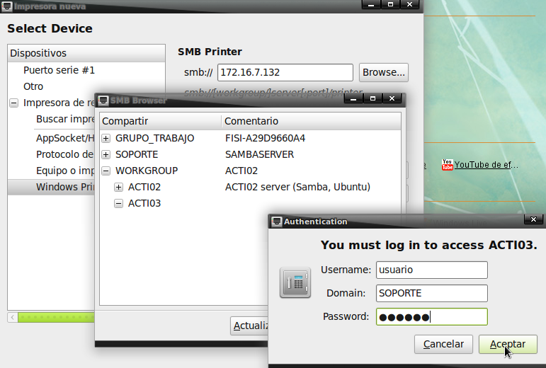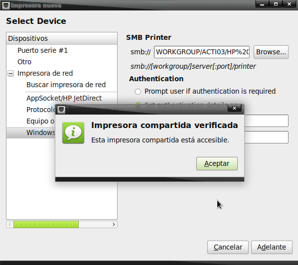 Al aceptar, pueden observar que el recuadro smb: se ha llenado con la ruta para imprimir, dicha ruta puede ser colocada manualmente, ver recuadro al final, puedes habilitar la opción set aunthentication details now, que significa que cada vez que mande a imprimir no te pedira contraseña