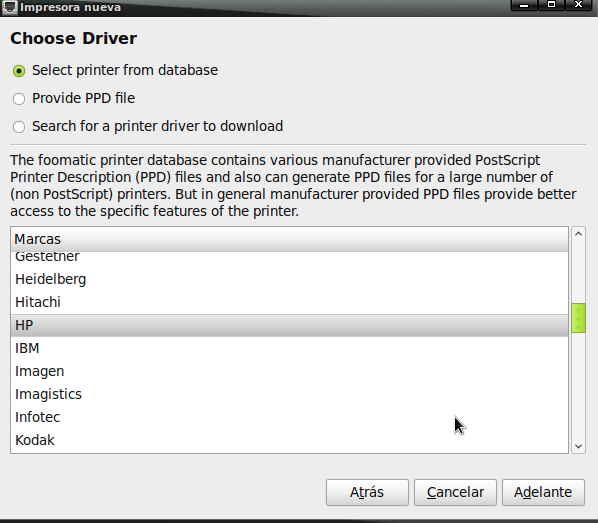 Selecciona el driver adecuado para configurar tu impresora en mi caso de ejemplo es HP laserjet P1505